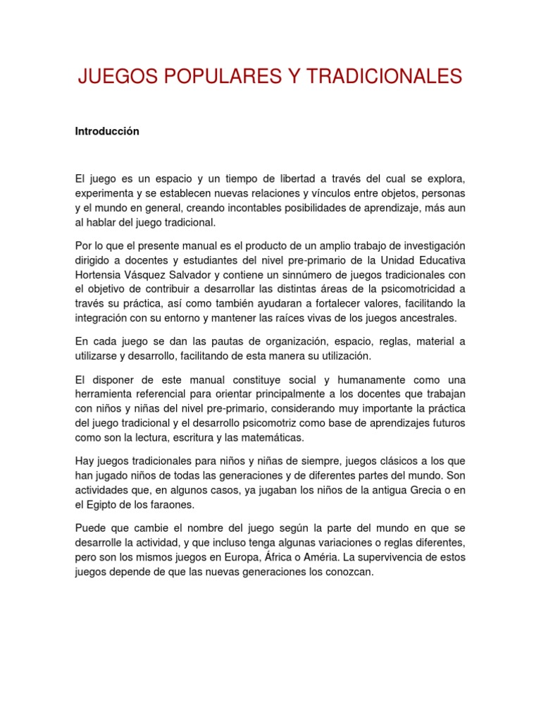 Los niños disfrutan jugando, especialmente con los juegos populares y tradicionales a los que se ha jugado durante generaciones y en diferentes partes del mundo. Al incluir dichas prácticas en las actividades diarias de los infantes diversos beneficios emergen, como es la estimulación de la imaginación y creatividad, el desarrollo de habilidades motrices básicas, genéricas, la coordinación, la adquisición de competencias, entre otras. Fundamentacion considerando que los niños ya vienen desde sus experiencias previas, sabiendo jugar algunos juegos tradicionales , considero significativo el abordaje de los juegos tradicionales, para que amplien y enriquezcan los conocimientos de otros juegos que no conocen. Estos juegos tradicionales y sus reglas eran empleados por los adultos, sin embargo, poco a poco fueron siendo del agrado de algunos niños y adolescentes. La petanca, el chito, los bolos, la rana, etc. Dentro de los juegos tradicionales juegos tradicionales juegos tradicionales encontramos una amplia gama de modalidades lúdicas: Actividades de educación física, aprendo en casa semana 12 ciclo iv Hay juegos tradicionales para niños, también considerados juegos folclóricos, a los que han jugado generación tras generación y en diferentes partes del mundo. Se pone en práctica los valores del respeto, compañerismo y cooperación. Y que incluso tenga algunas variaciones o reglas diferentes pero son los mismos juegos en europa africa o ameria. Los juegos tradicionales son los juegos infantiles clásicos o tradicionales, que se realizan sin ayuda de juguetes tecnológicamente complejos, sino con el propio cuerpo o con recursos fácilmente disponibles en la naturaleza (arena, piedrecitas, ciertos huesos como las tabas, hojas, flores, ramas, etc.) o entre objetos caseros (cuerdas, papeles, tablas, telas, hilos, botones, dedales. Entretenerse, divertirse tomando parte en uno de los juegos sometidos a reglas, medie o no en �l inter�s. Aquí encontraras un listado de los juegos tradicionales mexicanos más populares con sus reglas e instrucciones.